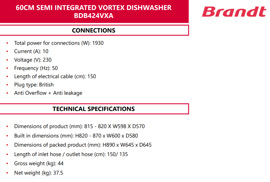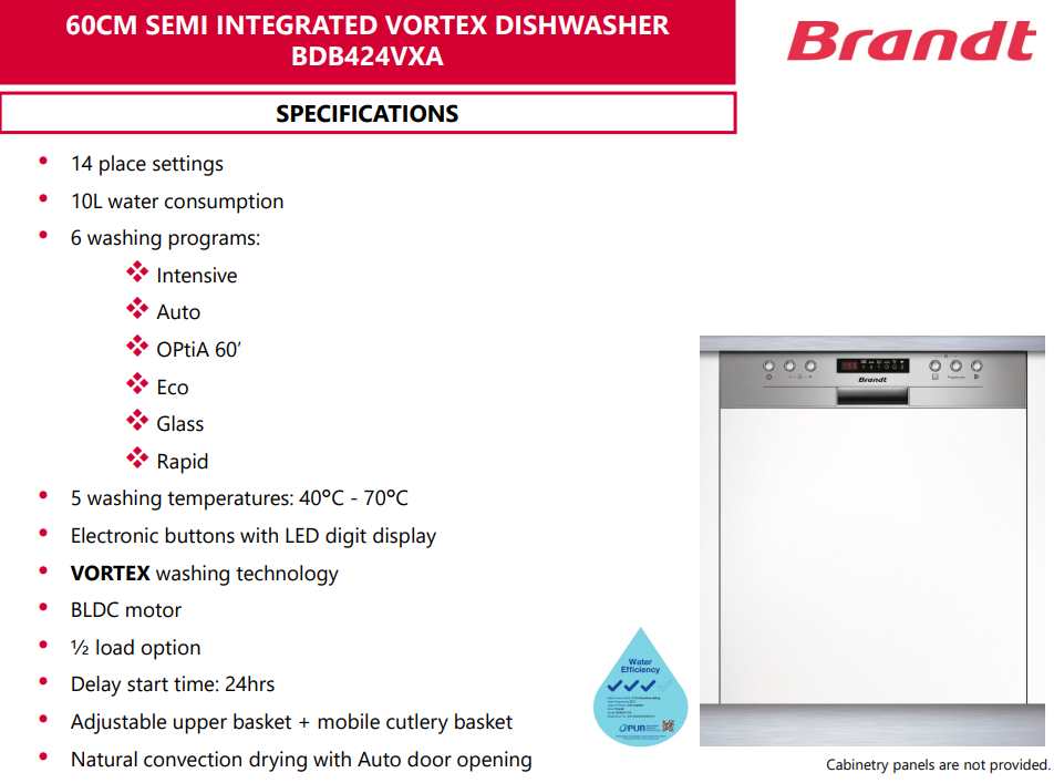 Brandt BRANDT BDB424VXA 60CM SEMI INTEGRATED BUILT-IN VORTEX DISHWASHER SKU: BDB424VXA S$1,599.00 S$1,008.00 Quantity 12345678 Descriptions If you have any questions, do feel free to drop us a text on WhatsApp or you contact us here 😊