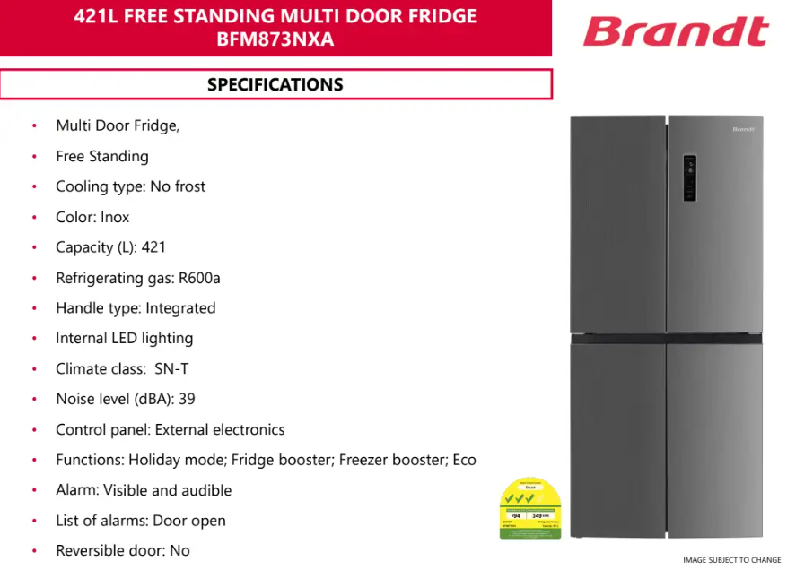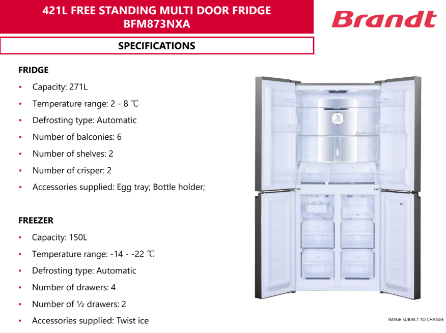 Brandt BRANDT BFM873NXA 421L INOX INVERTER MULTI DOOR REFRIGERATOR SKU: BFM873NXA S$2,199.00 S$1,799.00 Quantity 12345678 Descriptions If you have any questions, do feel free to drop us a text on WhatsApp or you contact us here 😊 You may also like Sharp SHARP SJ-VX57ES-DS 567L DARK INOX MULTI DOOR REFRIGERATOR S$2,899.00 S$2,522.00 Toshiba TOSHIBA GR-RM919WI-PGX(B3) 684L MATTE WHITE GLASS JAPANDI ARTISAN SERIES SEAMLESS FIT DESIGN MULTI DOOR REFRIGERATOR S$5,999.00 S$5,229.00 Toshiba TOSHIBA GR-RM631WE-PGX(A6) | GR-RM631WE-PGX(B1) 588L IVORY GOLD / BLACK MIRROR MULTI DOOR REFRIGERATOR S$3,329.00 S$2,659.00 Sharp SHARP SJ-VX57PG-BK 567L BLACK MULTI DOOR REFRIGERATOR S$2,999.00 S$2,737.00