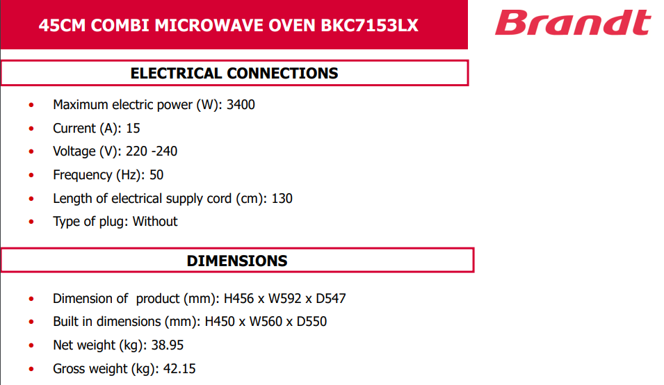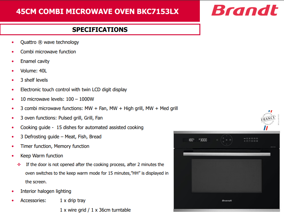 Brandt BRANDT BKC7153LX 40L BUILT-IN COMBI MICROWAVE OVEN SKU: BKC7153LX S$2,499.00 S$1,813.00 Quantity 12345678 Descriptions If you have any questions, do feel free to drop us a text on WhatsApp or you contact us here 😊 You may also like EF EF EFBM 2891 M 28L BLACK BUILT IN MICROWAVE OVEN S$809.00 S$569.00 Electrolux ELECTROLUX EMSB30XCF 60CM ULTIMATETASTE 900 BUILT-IN COMBINATION MICROWAVE OVEN WITH 30L CAPACITY S$999.00 S$699.00 Electrolux ELECTROLUX EMSB25XC ULTIMATETASTE 700 BUILT-IN COMBINATION MICROWAVE OVEN WITH 25L CAPACITY S$799.00 S$499.00 EF EF EFMO 8925 M FREE STANDING MICROWAVE OVEN WITH GRILL S$259.00 S$199.00