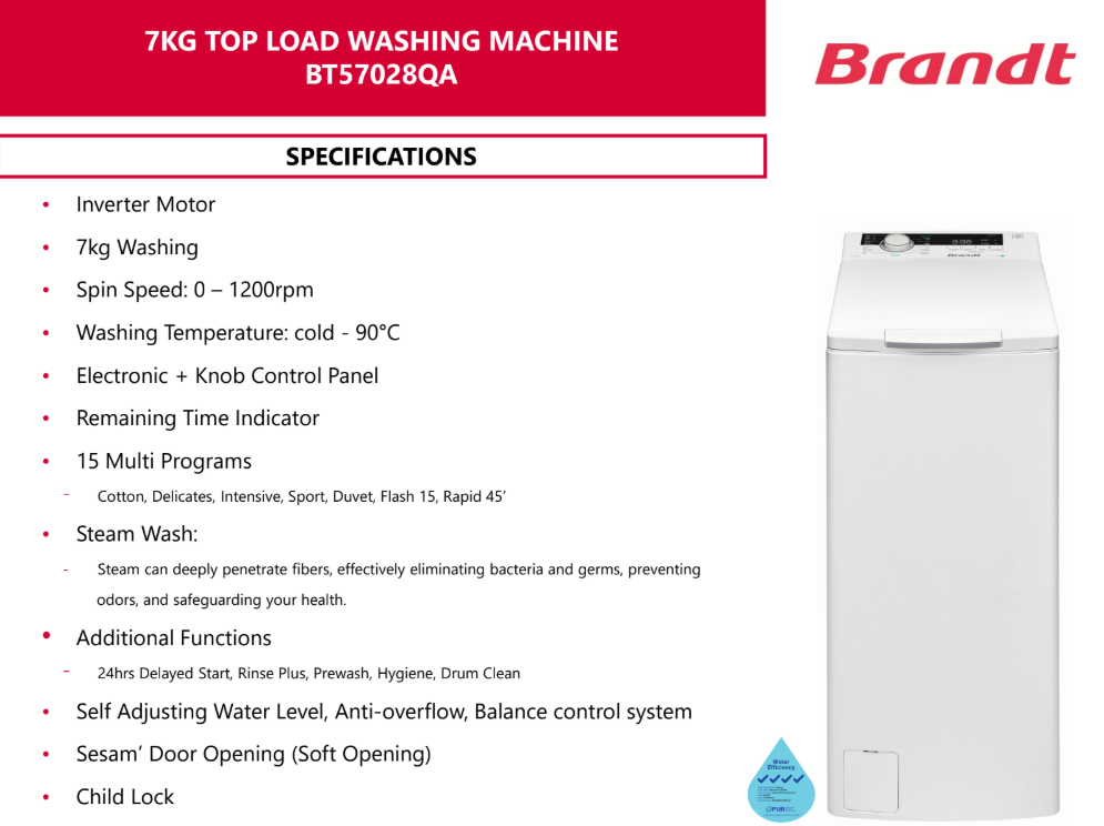 Brandt BRANDT BT57028QA 7KG 40CM WHITE 4 TICK TOP LOAD WASHING MACHINE SKU: BT57028QA S$1,399.00 S$789.00 Quantity 12345678 Descriptions If you have any questions, do feel free to drop us a text on WhatsApp or you contact us here 😊 You may also like Midea MIDEA MA200W75T 7.5KG 4 TICK GREY TOP LOAD WASHING MACHINE S$369.00 S$299.00 Sharp SHARP ES-W90EW-H 9KG TOP LOAD WASHING MACHINE WITH SELF-TUB CLEAN S$799.00 S$388.00 Midea MIDEA MA200W105DT 10.5KG 4 TICK TOP LOAD INVERTER WASHING MACHINE S$649.00 S$569.00 Sharp SHARP ES-W95TWXT-SA 9.5KG BLACK TOP LOAD WASHING MACHINE WITH NO-HOLES TUB S$849.00 S$599.00