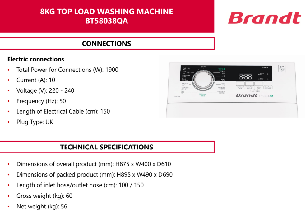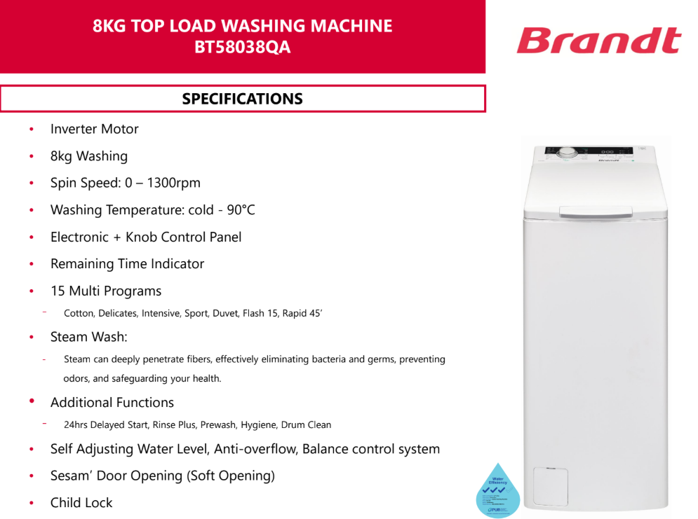 Brandt BRANDT BT58038QA 8KG 40CM WHITE 3 TICK TOP LOAD WASHING MACHINE SKU: BT58038QA S$1,415.00 S$899.00 Quantity 12345678 Descriptions If you have any questions, do feel free to drop us a text on WhatsApp or you contact us here 😊 You may also like Sharp SHARP ES-G80G | ES-G80G2 8KG 3 TICK / 4 TICK DARK GREY TOP LOAD WASHING MACHINE S$549.00 S$359.00 Toshiba TOSHIBA AW-M801AS(WS) WHITE 7KG 4 TICK TOP LOAD WASHING MACHINE S$429.00 S$369.00 Sharp SHARP ES-X968 9.5KG 3 TICK TOP LOAD WASHING MACHINE WITH SOFT CLOSING S$499.00 S$399.00 Whirlpool WHIRLPOOL WVFC900AJGR 9KG WHITE STAINWASH TOP LOAD WASHING MACHINE S$1,109.00 S$861.00
