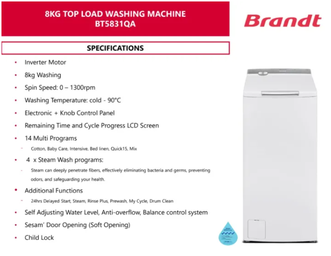 Brandt BRANDT BT5831QA 8KG 40CM WHITE 4 TICK INVERTER TOP LOAD WASHING MACHINE SKU: BT5831QA S$1,299.00 S$929.00 Quantity 12345678 Descriptions If you have any questions, do feel free to drop us a text on WhatsApp or you contact us here 😊 You may also like Brandt BRANDT BT58038QA 8KG 40CM WHITE 3 TICK TOP LOAD WASHING MACHINE S$1,415.00 S$899.00 Sharp SHARP ES-F120G | ES-F120G2 12KG INVERTER 3 TICK / 4 TICK TOP LOAD WASHING MACHINE S$899.00 S$699.00 Toshiba TOSHIBA AW-DUK1300KS 12KG TOP LOAD WASHING MACHINE WITH DIRECT DRIVE INVERTER MOTOR S$1,149.00 S$809.00 Sharp SHARP ES-G90G | ES-G90G2 9KG 3 TICK / 4 TICK DARK GREY TOP LOAD WASHING MACHINE S$599.00 S$428.00