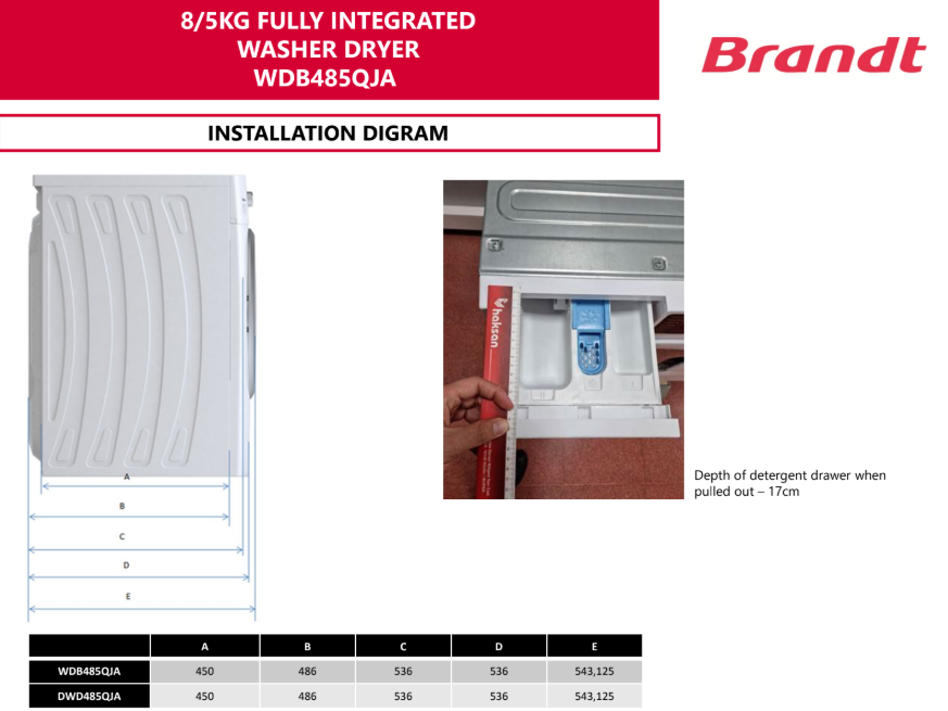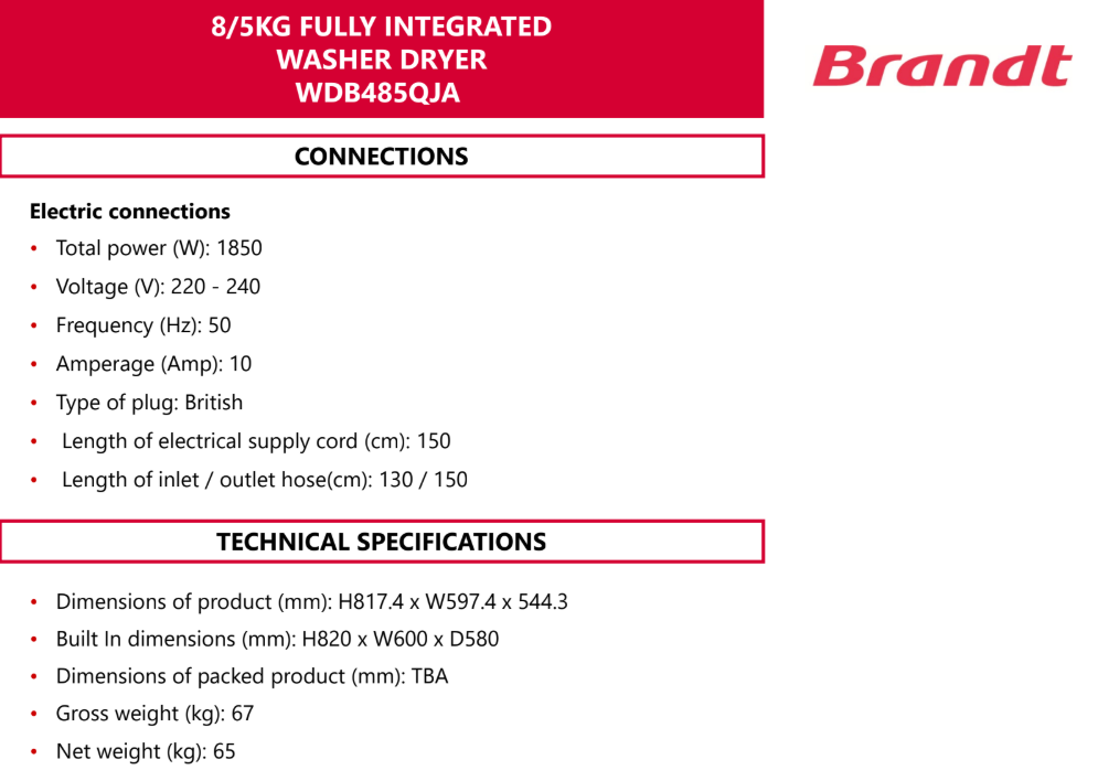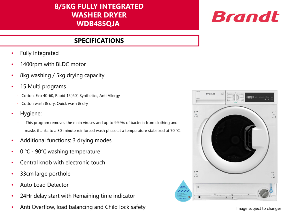 Brandt BRANDT WDB485QJA 8/5KG INTEGRATED 2 IN 1 WASHER CUM DRYER SKU: WDB485QJA S$1,899.00 S$1,100.00 Quantity 12345678 Descriptions If you have any questions, do feel free to drop us a text on WhatsApp or you contact us here š You may also like Brandt BRANDT WFB394QWA 9KG FRONT LOAD WASHING MACHINE S$898.00 S$708.00 Beko BEKO WCV7612BSG 7KG WHITE FRONT LOAD INVERTER WASHING MACHINE S$799.00 S$519.00 Electrolux ELECTROLUX EWW1143R7SC 11/7KG ULTIMATECARE⢠700 ONYX FRONT LOAD 2 IN 1 WASHER CUM DRYER S$3,099.00 S$1,599.00 EuropAce EUROPACE EFW 7801Y 8KG WHITE INVERTER FRONT LOAD WASHING MACHINE + EUROPACE EDY 8801Y 8KG WHITE FRONT LOAD HEAT PUMP DRYER S$2,999.00 S$1,329.00