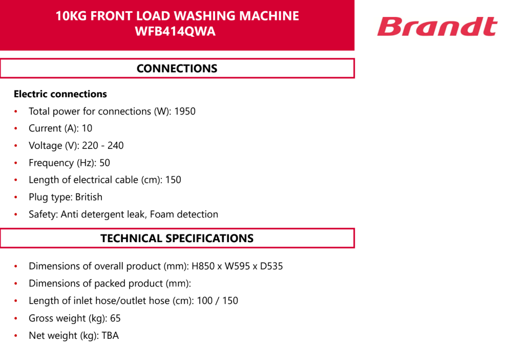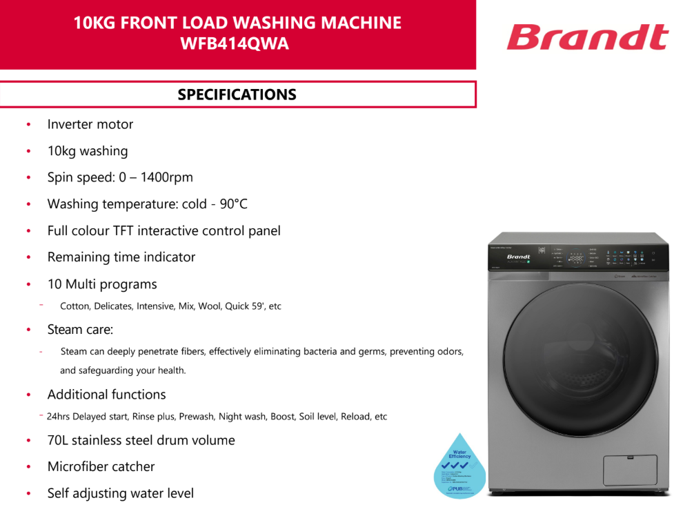 Brandt BRANDT WFB414QWA 10KG INVERTER FRONT LOAD WASHING MACHINE WITH STEAM CARE SKU: WFB414QWA S$1,399.00 S$1,000.00 Quantity 12345678 Descriptions If you have any questions, do feel free to drop us a text on WhatsApp or you contact us here š You may also like Electrolux ELECTROLUX EWF8024D3WB 8KG ULTIMATECARE⢠300 FRONT LOAD WASHING MACHINE + ELECTROLUX EDH804H3WB 8KG FRONT LOAD HEAT PUMP DRYER S$3,999.00 S$1,498.00 Brandt BRANDT WFB180WA 8KG WHITE FRONT LOAD WASHING MACHINE S$999.00 S$572.00 Whirlpool WHIRLPOOL FWEB9002GW | FWEB9002GG 9KG SANICARE WHITE / GREY FRONT LOAD WASHING MACHINE S$907.00 S$759.00 Brandt BRANDT WFBS94QWA 9KG INVERTER WHITE FRONT LOAD WASHING MACHINE S$1,299.00 S$665.00