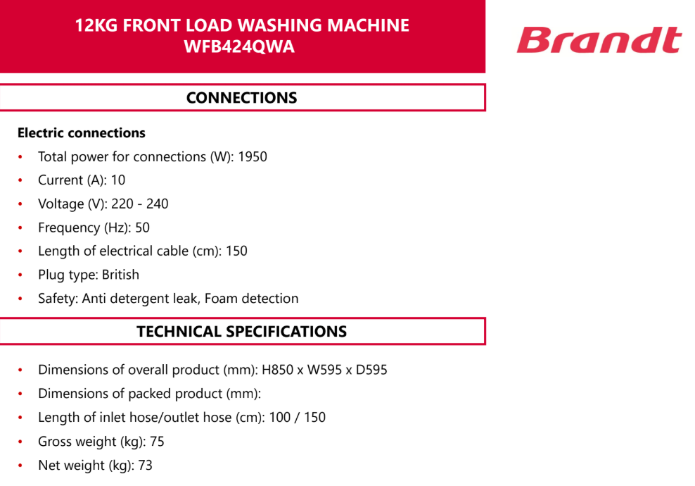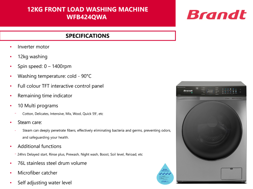 Brandt BRANDT WFB424QWA 12KG INVERTER FRONT LOAD WASHING MACHINE WITH STEAM CARE SKU: WFB424QWA S$1,499.00 S$1,200.00 Quantity 12345678 Descriptions If you have any questions, do feel free to drop us a text on WhatsApp or you contact us here 😊 You may also like Sharp SHARP ES-FW125SG 12.5KG DARK GREY FRONT LOAD INVERTER WASHING MACHINE S$1,999.00 S$1,610.00 Midea MIDEA MF210W105WB 10.5KG INVERTER SMART CONTROL FRONT LOAD WASHING MACHINE S$999.00 S$849.00 Brandt BRANDT WFBS94QWA 9KG INVERTER WHITE FRONT LOAD WASHING MACHINE S$1,299.00 S$665.00 Toshiba TOSHIBA TW-T23BU105UWS(SK) 9.5KG DARK GREY INVERTER FRONT LOAD WASHING MACHINE S$1,099.00 S$849.00