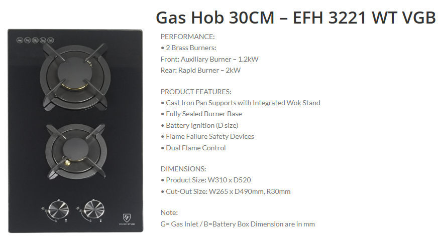 EF EF EFH 3221 WT VGB 30CM 2 BURNER BLACK TEMPERED GLASS BUILT IN GAS HOB SKU: EFH 3221 WT VGB S$389.00 S$359.00 Quantity 12345678 Descriptions If you have any questions, do feel free to drop us a text on WhatsApp or you contact us here 😊 You may also like Elba ELBA EHS 321D1 S 30CM 2 BURNER STAINLESS STEEL GAS HOB S$419.00 S$349.00 Elba ELBA ELIO 75-300D1 3 BURNER STAINLESS STEEL GAS HOB S$759.00 S$639.00 Elba ELBA EHS 635D1 SB 60CM 3 BURNER STAINLESS STEEL GAS HOB S$529.00 S$458.00 Rinnai RINNAI RB-93TG 3 BURNER HYPER FLAME GLASS HOB WITH SAFETY DEVICE S$710.00 S$638.00