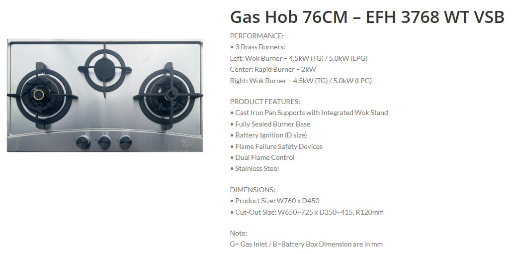 EF EF EFH 3768 WT VSB 76CM 3 BURNER STAINLESS STEEL BUILT IN GAS HOB App SKU: EFH 3768 WT VSB S$489.00 Quantity 12345678 Descriptions If you have any questions, do feel free to drop us a text on WhatsApp or you contact us here 😊 You may also like Elba ELBA EHS 945D1 SB 4 BURNER STAINLESS STEEL GAS HOB S$629.00 S$539.00 Rinnai RINNAI RB-93US 3 BURNER HYPER FLAME STAINLESS STEEL BUILT-IN HOB S$690.00 S$628.00 Elba ELBA ELIO 65-445D1 4 BURNER STAINLESS STEEL GAS HOB S$649.00 S$559.00 Elba ELBA ELIO 75-300D1 3 BURNER STAINLESS STEEL GAS HOB S$759.00 S$639.00