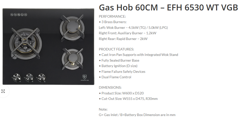 EF EF EFH 6530 WT VGB 60CM 3 BURNER BUILT IN GLASS GAS HOB SKU: EFH 6530 WT VGB S$569.00 S$429.00 Quantity 12345678 Descriptions If you have any questions, do feel free to drop us a text on WhatsApp or you contact us here 😊 You may also like Rinnai RINNAI RB-783G FLEXIHOB 78CM 3 BURNER GLASS BUILT-IN GAS HOB S$670.00 S$538.00 Rinnai RINNAI RH-S95A-SSVR 90CM SLIMLINE HOOD + RINNAI RB-93TS 3 BURNER HYPER FLAME STAINLESS STEEL BUILT-IN HOB S$1,100.00 S$865.70 Electrolux ELECTROLUX EGC3320NOK 30CM ULTIMATETASTE 300 BUILT-IN GAS HOB WITH 2 BURNERS + EHI3251BE 2 ZONE 30CM BUILT-IN INDUCTION HOB S$1,328.00 EF EF EFH 2764 WT VSB 2 BURNER STAINLESS STEEL HOB WITH SAFETY VALVE S$469.00 S$399.00