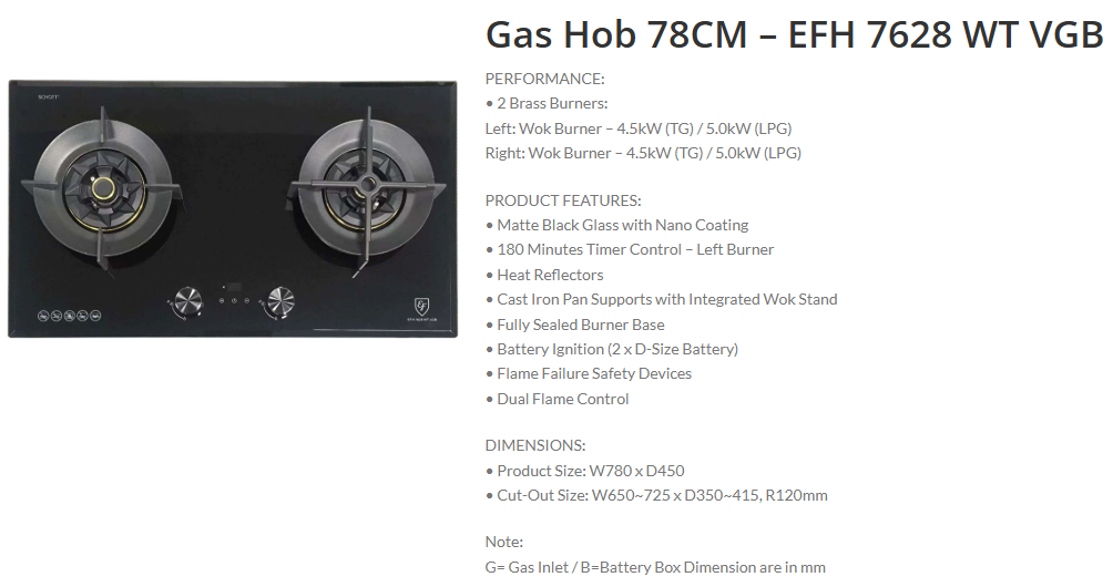 EF EF EFH 7628 WT VGB 78CM 2 BURNER BUILT IN MATT BLACK GLASS GAS HOB WITH TIMER SKU: EFH 7628 WT VGB S$629.00 S$499.00 Quantity 12345678 Descriptions If you have any questions, do feel free to drop us a text on WhatsApp or you contact us here 😊 You may also like Electrolux ELECTROLUX EGC3310NVK BUILT-IN GAS HOB WITH 1 BURNER + ELECTROLUX EGC3320NOK 30CM BUILT-IN GAS HOB WITH 2 BURNERS S$1,238.00 Rinnai RINNAI RB-72S 2 BURNER HYPER FLAME STAINLESS STEEL BUILT-IN HOB S$550.00 S$508.00 EF EF EFH 9730 TN VGB 3 BURNER BUILT-IN GLASS GAS HOB S$629.00 S$439.00 Elba ELBA EHS 948D1 S 4 BURNER STAINLESS STEEL GAS HOB WITH HOTPLATE S$719.00 S$609.00