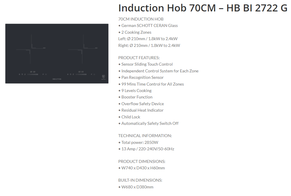 EF EF HB BI 2722 G 70CM 2 ZONE BUILT IN INDUCTION HOB WITH SENSOR SLIDING TOUCH CONTROL SKU: HB BI 2722 G S$999.00 S$889.00 Quantity 12345678 Descriptions If you have any questions, do feel free to drop us a text on WhatsApp or you contact us here 😊 You may also like Whirlpool WHIRLPOOL WSB2360BFP 3 ZONE 60CM BUILT-IN INDUCTION HOB S$1,499.00 S$1,299.00 Elba ELBA EIN 603 XF (EIN603XF) 60CM 3 ZONE BUILT-IN INDUCTION HOB S$1,899.00 S$1,289.00 Valenti VALENTI VIC2702 70CM 2 ZONE SCHOTT GLASS INDUCTION HOB S$1,138.00 S$967.30 EF EF HB BI 583 A 4 ZONE BUILT-IN INDUCTION HOB S$1,559.00 S$999.00