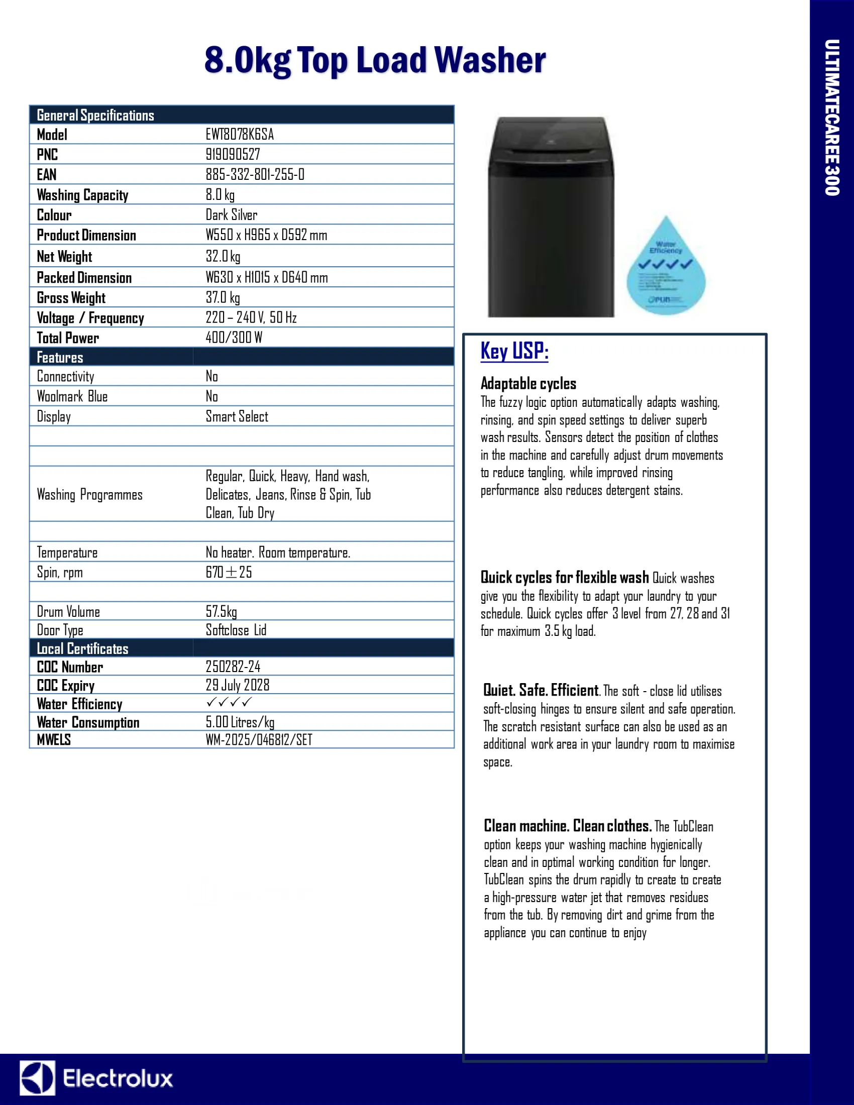Electrolux ELECTROLUX EWT8078K6SA 8KG ELITECARE 300 4 TICK TOP LOAD WASHING MACHINE SKU: EWT8078K6SA S$649.00 S$379.00 Quantity 12345678 Descriptions If you have any questions, do feel free to drop us a text on WhatsApp or you contact us here 😊 You may also like Midea MIDEA MA200W105D 10.5KG TOP LOAD INVERTER WASHING MACHINE S$699.00 S$515.00 Beko BEKO BTU1008S 10KG SILVER TOP LOAD WASHING MACHINE S$859.00 S$419.00 Toshiba TOSHIBA AW-J900DS 8KG TOP LOAD WASHING MACHINE S$489.00 S$329.00 Electrolux ELECTROLUX EWT0H88H1WB 10.5KG ELITECARE 300 TOP LOAD WASHING MACHINE S$899.00 S$399.00