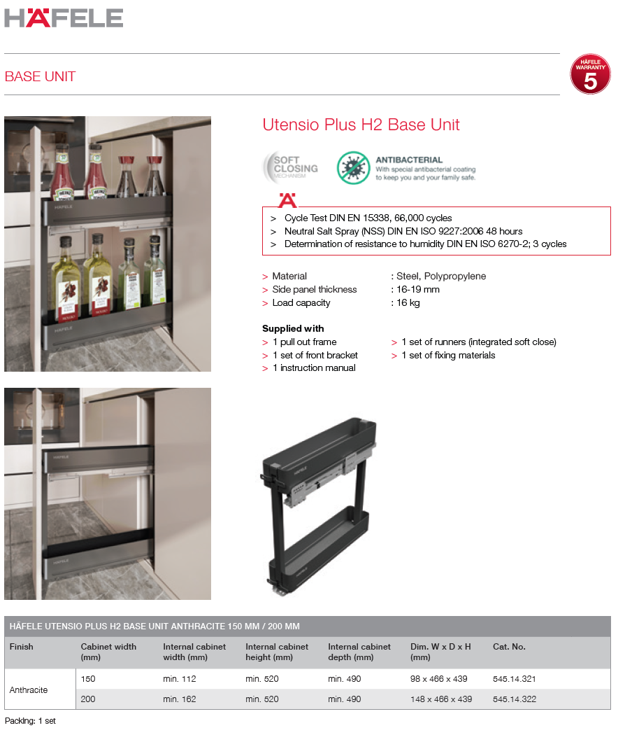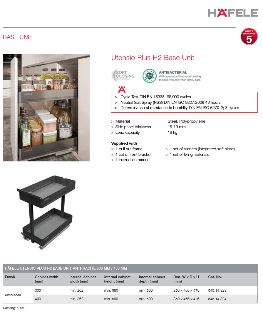 Hafele HAFELE UTENSIO PLUS H2 15 / 20 / 30 / 40CM ANTHRACITE BASE CABINET STORAGE UNIT SKU: 545.14.321 S$229.00 S$199.00 Size * 15cm20cm30cm40cm Quantity 12345678 Descriptions If you have any questions, do feel free to drop us a text on WhatsApp or you contact us here 😊 You may also like Hafele HAFELE UTENSIO PLUS H2 30CM ANTHRACITE MULTI BASE CABINET STORAGE UNIT S$349.00 S$299.00 Hafele HAFELE UTENSIO PLUS H2 30 / 40CM TALL LARDER KITCHEN STORAGE UNIT S$869.00 S$839.00