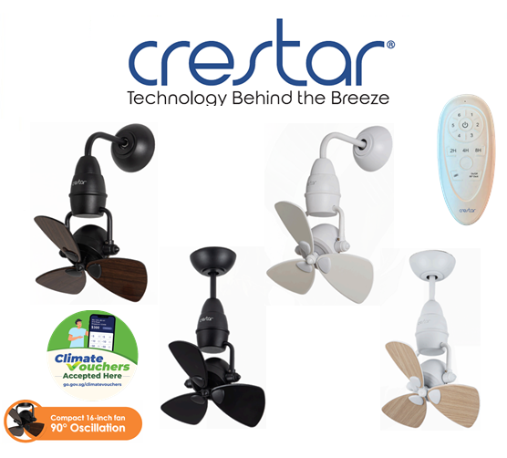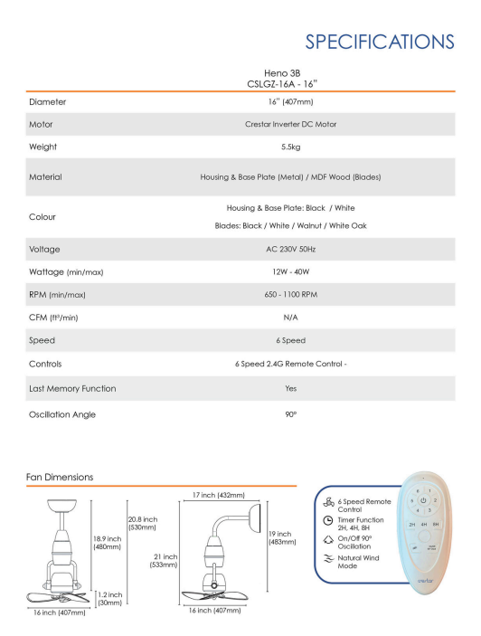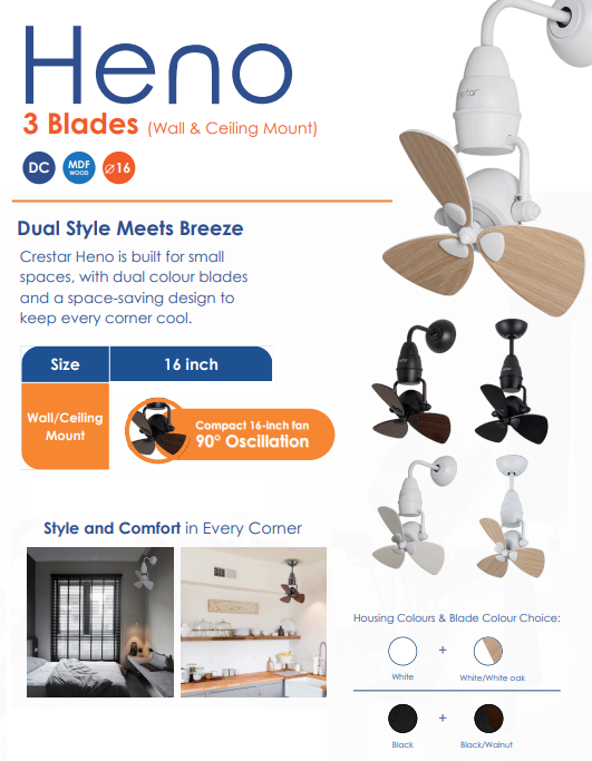 CRESTAR HENO 16 INCH 3 BLADE BLACK / WHITE / WALNUT / WHITE OAK DC MOTOR CORNER FAN