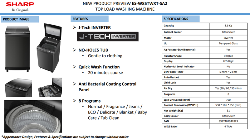 Sharp SHARP ES-W85TWXT-SA2 8.5KG BLACK 4 TICK TOP LOAD WASHING MACHINE WITH NO-HOLES TUB SKU: ES-W85TWXT-SA2 S$799.00 S$629.00 Quantity 12345678 Descriptions If you have any questions, do feel free to drop us a text on WhatsApp or you contact us here 😊 You may also like Sharp SHARP ES-W105TWXT-SA2 10.5KG INVERTER 4 TICK TOP LOAD WASHING MACHINE S$899.00 S$729.00 Toshiba TOSHIBA AW-DUK1300KS(MK) MORANDI GREY 12KG 4 TICK INVERTER TOP LOAD WASHING MACHINE S$899.00 S$729.00 Whirlpool WHIRLPOOL VWVD9512GG 9.5KG STAINCLEAN DIRECT DRIVE TOP LOAD WASHING MACHINE S$799.00 S$576.00 Toshiba TOSHIBA AW-M801AS(WS) WHITE 7KG 4 TICK TOP LOAD WASHING MACHINE S$429.00 S$349.00