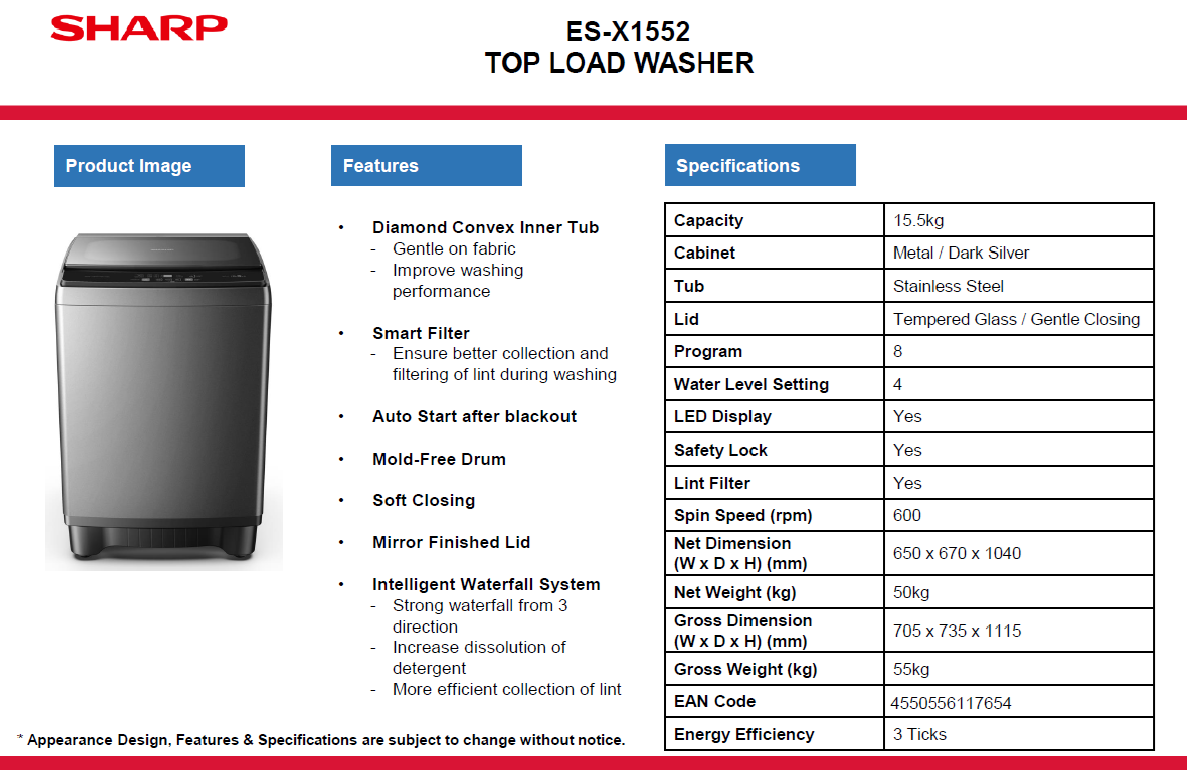 Sharp SHARP ES-X1552 15.5KG DARK SILVER 4 TICK TOP LOAD WASHING MACHINE SKU: ES-X1552 S$999.00 S$744.00 Quantity 12345678 Descriptions If you have any questions, do feel free to drop us a text on WhatsApp or you contact us here 😊 You may also like Midea MIDEA MA200W85T 8.5KG 4 TICK LUNAR DIAL TOP LOAD WASHING MACHINE S$469.00 S$399.00 Sharp SHARP ES-W95TWXT-SA 9.5KG BLACK TOP LOAD WASHING MACHINE WITH NO-HOLES TUB S$849.00 S$638.00 Electrolux ELECTROLUX EWT8078K6SA 8KG ELITECARE 300 4 TICK TOP LOAD WASHING MACHINE S$649.00 S$379.00 Whirlpool WHIRLPOOL 3LWTW4815FW 15KG PROFESSIONAL HIGH EFFICIENCY AGITATOR TOP LOAD WASHING MACHINE S$1,699.00 S$1,630.00