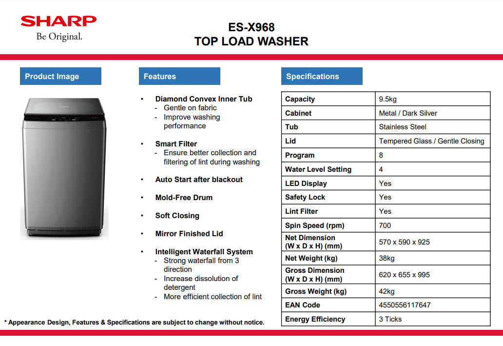 Sharp SHARP ES-X968 9.5KG 3 TICK TOP LOAD WASHING MACHINE WITH SOFT CLOSING SKU: ES-X968 S$499.00 S$399.00 Quantity 12345678 Descriptions If you have any questions, do feel free to drop us a text on WhatsApp or you contact us here 😊 You may also like Toshiba TOSHIBA AW-DUK1300KS(MK) MORANDI GREY 12KG 4 TICK INVERTER TOP LOAD WASHING MACHINE S$899.00 S$729.00 Toshiba TOSHIBA AW-M901BS(WS) WHITE 8KG 4 TICK TOP LOAD WASHING MACHINE S$499.00 S$389.00 Sharp SHARP ES-G80G | ES-G80G2 8KG 3 TICK / 4 TICK DARK GREY TOP LOAD WASHING MACHINE S$549.00 S$359.00 Midea MIDEA MA100W75G 7.5KG DARK GREY TOP LOAD WASHING MACHINE S$329.00 S$249.00