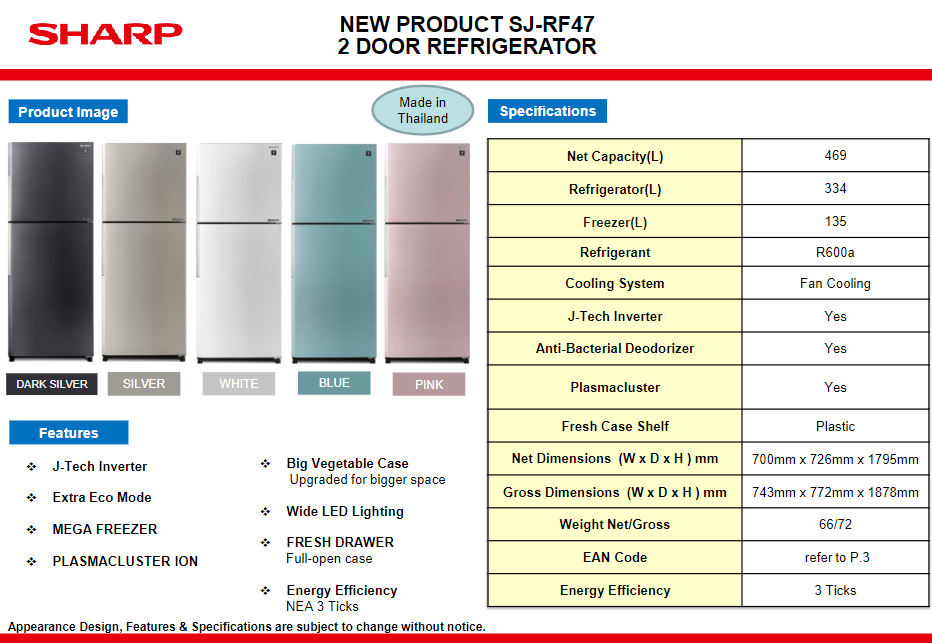 Sharp SHARP SJ-RF47E-WH 469L WHITE J-TECH INVERTER 2 DOOR TOP FREEZER REFRIGERATOR SKU: SJ-RF47E-WH S$1,499.00 S$1,350.00 Quantity 12345678 Descriptions J-Tech Inverter Extra Eco Mode Mega Freezer Plasmacluster Ion Big Vegetable Case Wide LED Lighting Fresh Drawer 3 Ticks Dimension: W700 x D726 x H1795mm If you have any questions, do feel free to drop us a text on WhatsApp or you contact us here 😊 You may also like Sharp SHARP SJ-RF47E-SL 469L SILVER J-TECH INVERTER 2 DOOR TOP FREEZER REFRIGERATOR S$1,499.00 S$1,350.00 Electrolux ELECTROLUX ETM4200A-B 415L 600 SERIES INVERTER BLACK TOP FREEZER REFRIGERATOR S$1,499.00 S$999.00 Sharp SHARP SJ-U43P 433L SILVER TOP FREEZER REFRIGERATOR S$1,499.00 S$1,180.00 MIDEA MDRT489FGX46 339L STAINLESS STEEL INVERTER SMART SENSOR TOP FREEZER REFRIGERATOR S$1,099.00 S$759.00