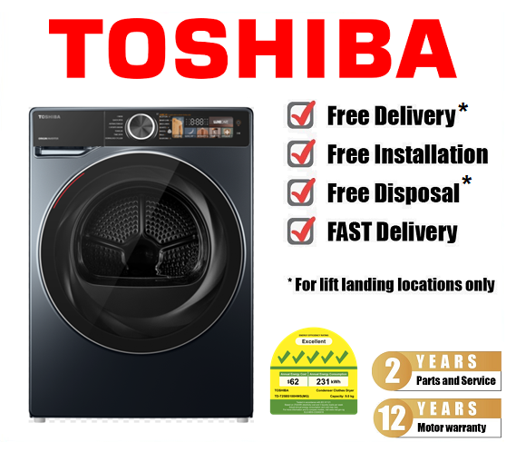 Toshiba TOSHIBA TD-T25BS100HWS(MG) DARK GREY 9KG DUAL INVERTER SMART CONTROL FRONT LOAD HEAT PUMP DRYER SKU: TD-T25BS100HWS(MG) S$1,599.00 S$1,429.00 Quantity 12345678 Descriptions If you have any questions, do feel free to drop us a text on WhatsApp or you contact us here 😊 You may also like Elba ELBA EBD 781H VT (EBD781HVT) 7KG WHITE FRONT LOAD HEAT PUMP DRYER S$1,099.00 S$799.00 Midea MIDEA MD200H80WW | MD200H80T 8KG WHITE / DARK GREY FRONT LOAD HEAT PUMP DRYER S$1,099.00 S$879.00 Whirlpool WHIRLPOOL HWFB9002GW 9KG FRESHCARE+ FRONT LOAD HEAT PUMP DRYER S$1,699.00 S$1,599.00 Whirlpool WHIRLPOOL HFCX80410 8KG FRESHCARE+ FRONT LOAD INVERTER HEAT PUMP DRYER S$1,599.00 S$1,469.00