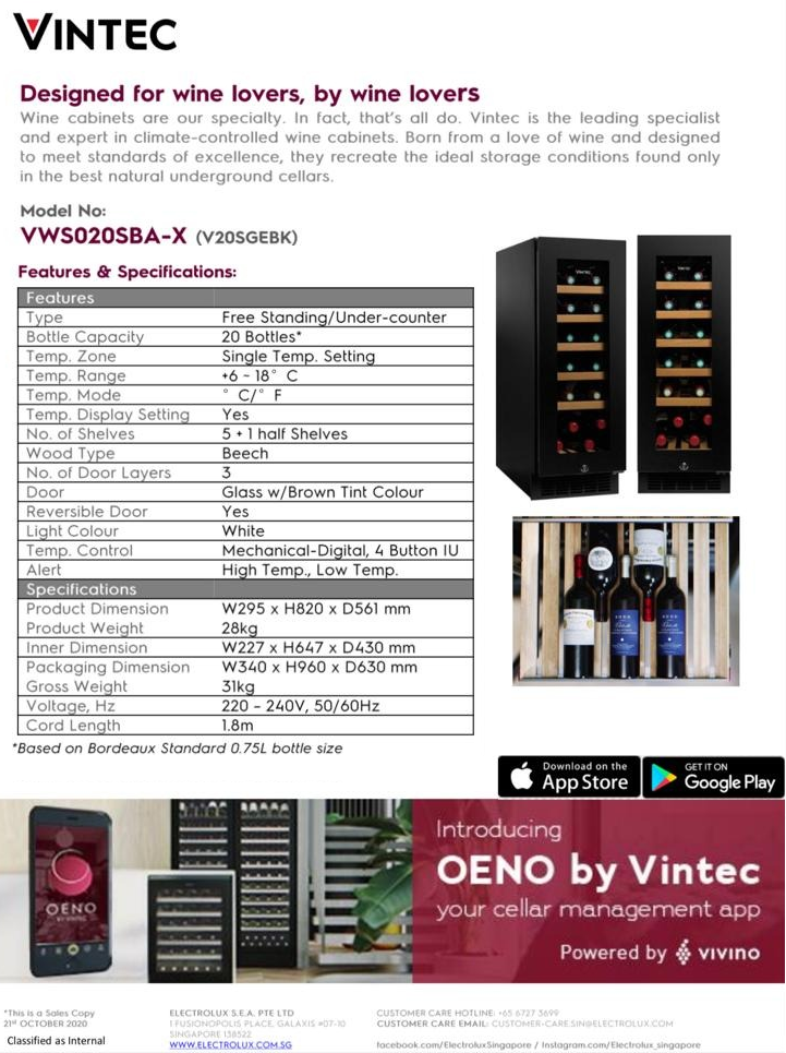 VINTEC VWS020SBA-X 20 BOTTLES NOIR SERIES SINGLE ZONE WINE CELLAR